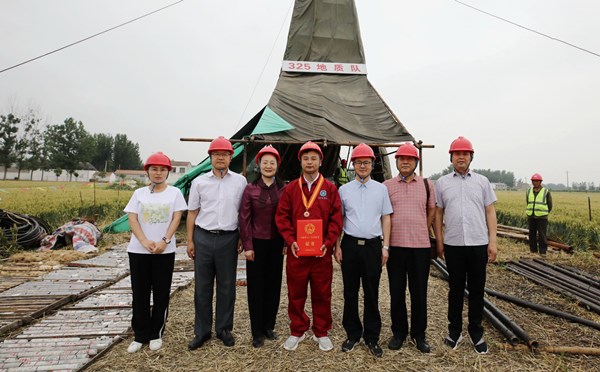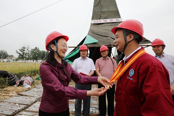 5月18日上午,在萧县旗杆楼铁矿钻探施工现场,安徽省能源化学地质工会副主席吴翠玉为325地质队汤磊鑫佩戴省“五一劳动奖章”,并颁发荣誉证书。