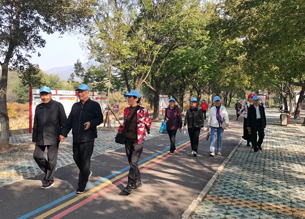 在五柳景区内,老同志们相携而行,漫步在林荫小道或是花径间,一边沐浴着秋日的暖阳,一边欣赏着碧波荡漾的龙泉湖、岸边垂柳、彩沙、紫竹等秀丽景色。他们或驻足欣赏、或拍照留念、或共拍抖音视频、或展示舞龙,尽情诠释着最美夕阳红。