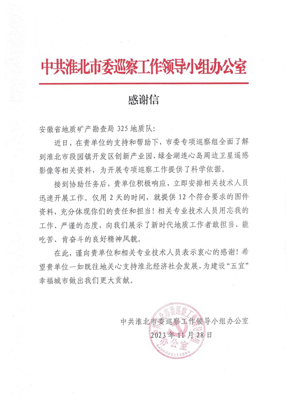 近日,中共淮北市委巡察工作领导小组办公室向325地质队发来感谢信,对该队高质量、高标准、高效率提供淮北部分区域历年卫星遥感影像对比图等相关资料,协助巡察组精准发现问题表示感谢,对相关专业技术人员展现的精湛专业素养和过硬的工作作风给予高度肯定。