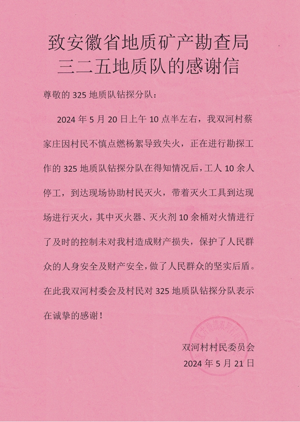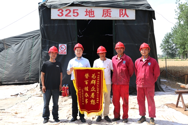 近日,淮北市烈山区古饶镇双河村村委书记赵斌将一面印有“为群众着想 替百姓办事”的锦旗,送到325队副队长娄长增手中,感谢地质工作者在危急时刻挺身而出,协助村民灭火,以实际行动守护群众人身和财产安全。