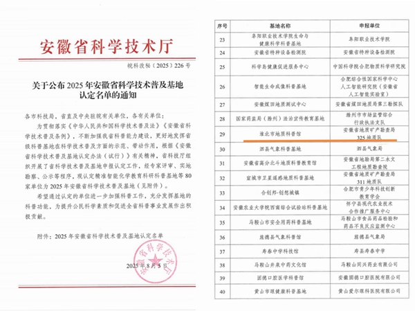 近日,安徽省科学技术厅公布了2025年安徽省科学技术普及基地认定名单,我队申报的“淮北市地质科普馆”荣列其中。
